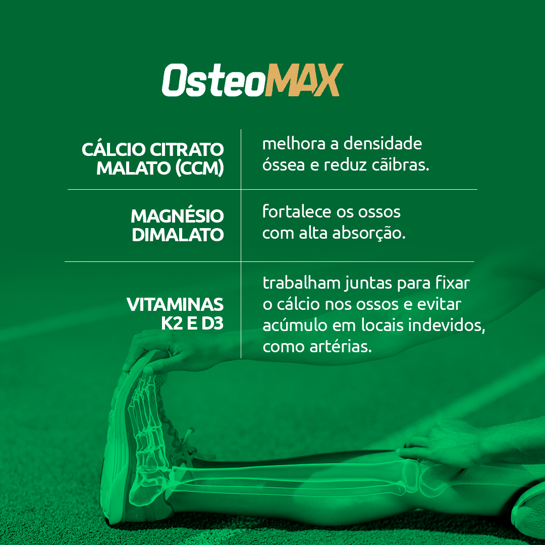 OsteoMax foi desenvolvido para auxiliar no fortalecimento e na manutenção da saúde óssea. Sua fórmula avançada combina Cálcio Citrato Malato (CCM), Magnésio Dimalato e Vitaminas K2 e D3, nutrientes essenciais para a absorção do cálcio e a preservação da densidade mineral óssea, ajudando na prevenção de osteopenia e osteoporose.